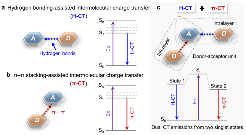 开发具有开关可切换响应性的智能发光材料,使其能够响应外部刺激从暗态到亮态的转换,已经引起了研究领域的极大兴趣。然而,大多数报道的体系仅具有单色切换功能,极大地限制了其在高级应用中的拓展。在前期工作中,杨新一课题组提出利用压强处理工程和氢键协同效应,在间苯二甲酸中点亮并稳定三重态激子,成功在环境条件下实现高效荧光/磷光混合型白光发射(Nat. Commun. 2024, 15, 7778)。进一步又利用高压诱导分子重排触发无荧光邻苯二甲酸酐的高效蓝光发射(Laser Photonics Rev. 2025, 19, 2401173)。最近,利用压强工程调控分子堆积构型实现苯硼酸高效蓝光发射(Laser Photonics Rev. 2025, 19, 2401537)。基于前期对有机小分子光物理过程的有效调控,针对初始不发光的有机分子材料,如何通过压强工程实现多色发光,一直以来是课题组追求的目标。