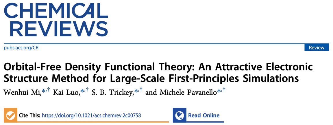 米文慧教授及合作者对无轨道密度泛函理论进行系统综述,相关研究成果以“Orbital-Free Density Functional Theory: An attractive electronic structure method for large-scale first-principles simulations”为题,于2023年10月23日在线发表于《Chemical Reviews》。Chemical Reviews (2023年影响因子:62.1)是由美国化学学会于1924年创刊并发行至今的国际化学领域内最具权威性的学术期刊之一,致力于发表最具影响力的综述文章,以综合性、权威性以及可读性强而著称。