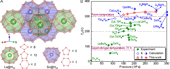 图1:(A) 新型高温超导体LaSc2H24的晶体结构示意图。(B) 典型氢化物超导材料的超导温度与压强的关系,其中未填充和半填充的符号分别表示亚稳和稳定结构。