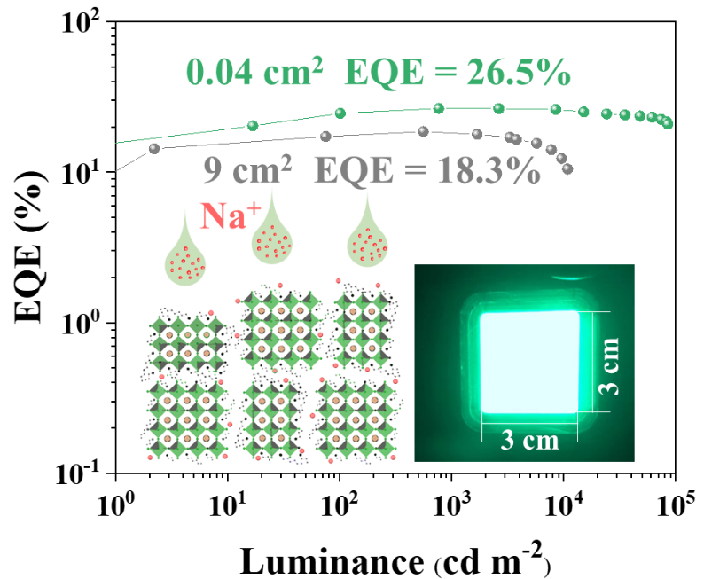 准二维钙钛矿发光二极管(Q-2D PeLEDs)作为一种新兴发光技术,因其卓越的光电特性而备受瞩目。近年来,Q-2D PeLEDs的外量子效率取得了飞快发展,展示了其作为下一代光电器件的巨大潜力。然而,这些进展绝大多数仅限于实验室的小面积器件,且通常在平方毫米级别,实现大面积制备的高效器件仍是一个不可回避的挑战。因此,如何制备高效且稳定的大面积Q-2D PeLEDs成为未来全彩显示和固态照明应用的关键难题。