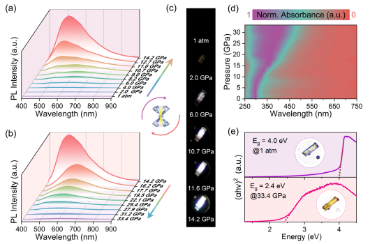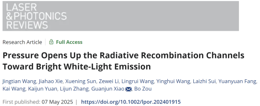 高压与超硬材料全国重点实验室邹勃教授团队肖冠军教授等人在全无机非铅金属卤化物的压强诱导发光研究中取得重要进展,通过高压打开了辐射跃迁通道,实现了一维金属卤化物Cs2AgI3从“无光”到“有光”的反常压强诱导PIE行为(Pressure-Induced Emission, PIE),产生了高压下的高品质明亮白光发射,并深入揭示了背后的物理机制,推动了压力传感、压力开关和高压极端条件下的特种照明与显示应用。相关研究成果以“Pressure Opens Up the Radiative Recombination Channels Toward Bright White-Light Emission”为题发表在《Laser & Photonics Reviews》上。