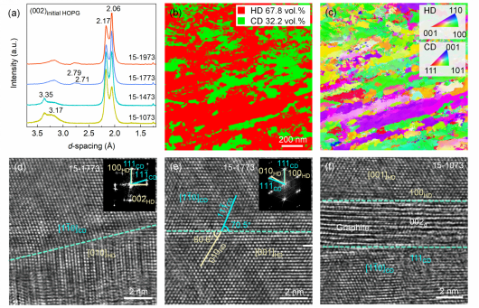 6. 在20 GPa-1200 ℃条件下,分别沿z轴和xy平面热压缩石墨实现向六方金刚石(HD)和立方金刚石(CD)的相变研究。