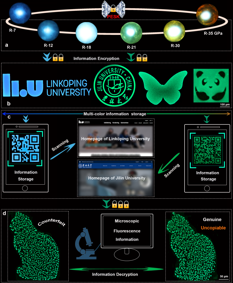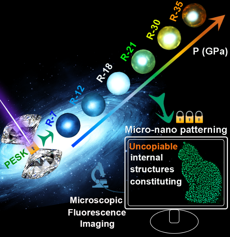 材料科学与工程学院张立军教授、瑞典林雪平大学高峰教授,在压强诱导发光的常压截获及光学加密防伪研究取得重要进展。研究团队利用压力工程调控杂化金属卤化物材料的局域激发态和电荷转移态,成功实现了涵盖可见光范围由红到蓝的多色动态调控。该研究创造性提出了“压强工程密钥”(Pressure Engineering Secret Key, PESK)概念,将压强作为光学防伪的独特密钥,通过建立亚稳态材料光学特性与压强条件的精确对应关系,构筑了多级物理不可复制的新型加密防伪体系。本研究不仅为光学防伪技术拓展了新维度,大大增强了裸眼识别与可视化信息加密能力,更显著提升了防伪系统的安全等级。相关研究成果以“Pressure Encryption Toward Physically Uncopiable Anti-Counterfeiting”为题,发表在《自然·通讯》上(Nature Communications, 2025, 16, 6203)。