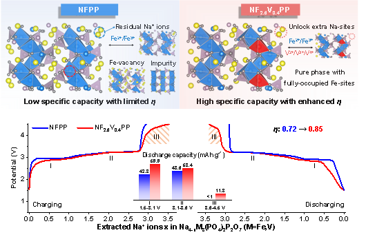 杂化磷酸盐正极Na4Fe3(PO4)2P2O7 (NFPP) 因其坚固的三维框架而成为钠离子电池正极的热门候选材料。然而NFPP的比容量较低,限制了其能量密度的发挥。这一问题主要源于合成过程中产生的非活性NaFePO4杂相,此前大量研究致力于通过引入Fe空位或非活性元素掺杂等策略来消除杂相,然而这也同时导致了过渡金属位点的可用氧化还原电对数量降低,因此仍难以充分激发NFPP的容量。此外,关于NFPP中空位诱导杂相形成的内在机制仍不明确,深入理解该机制对于推动NFPP的工业化生产至关重要。