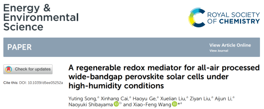 近日,动漫巴士 新型电池物理与技术教育部重点实验室王晓峰教授团队宽带隙钙钛矿太阳能电池研究方面取得重要进展,相关成果以A regenerable redox mediator for all-air processed wide-bandgap perovskite solar cells under high-humidity conditions”为题发表在国际权威期刊《Energy & Environmental Science》上。