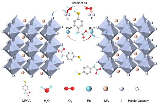 该工作展示了通过引入4-巯基苯乙酸(MPAA)作为氧化还原介质,成功实现了WBG 钙钛矿太阳能电池在空气中(相对湿度65%)的高效制备。MPAA不仅通过硫醇-二硫键的可逆转换,有效抑制了相分离,还因其苯环结构的疏水性,为钙钛矿薄膜筑起了一道防潮屏障。采用MPAA掺杂的WBG 钙钛矿太阳能电池实现了23.16%的显著光电转换效率PCE,刷新了空气制备WBG 钙钛矿太阳能电池的效率纪录。其有效面积13平方厘米的微型组件也实现了18.46%的PCE,彰显了规模化生产的潜力。此外,这些设备表现出卓越的长期稳定性这项研究不仅攻克了WBG 钙钛矿太阳能电池在高湿度环境下制造的难题,为钙钛矿太阳能技术的未来商业化奠定了关键基础。