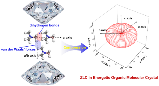 高压与超硬材料全国重点实验室肖冠军教授等人在含能有机零压缩材料研究中取得重要进展。研究团队开展了富氢材料——三甲胺硼烷络合物(trimethylamine borane,TMAB)的压缩行为研究,首次在有机晶体材料中发现零线性压缩行为。研究发现压强诱导C-H···H-B相互作用从范德华力向双氢键转变,双氢键的协同作用导致与其平行的c轴发生零线性压缩;证明富氢材料TMAB可作为抗冲击材料,用作固体推进剂的添加剂。该研究建立了弱相互作用与零压缩行为之间的关联,为有机零压缩材料的研发提供了重要思路。相关成果以“Dihydrogen Bond Cooperativity Resolves Zero-Linear Compressibility in an Energetic Crystal”为题发表在《Angewandte Chemie International Edition》上。
