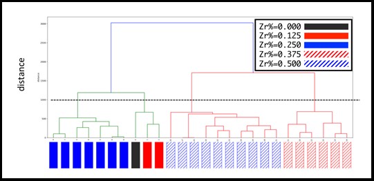 Clustering over the XRD peak patterns (26 in total) of [Sm1−yZry] Fe11Ti, performed by DTW (dynamical-time-wrapping) scoring and Ward linkage method. Putting the threshold around 1,000 for the dissimilarity (horizontal broken line), the patterns are clustered into four groups, sharing almost the same number of the substitutions by Zr. The red arrows at the bottom show the errors where a ’zero substitution’ is wrongly sorted into the group with ’one substitution’ etc.