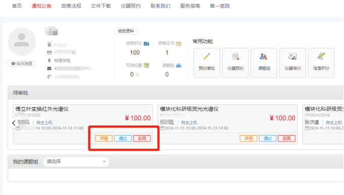 7. 仪器管理员登陆系统,在系统动漫巴士可看到相应的预约情况,经过管理员审批同意后,则顺利完成仪器预约。