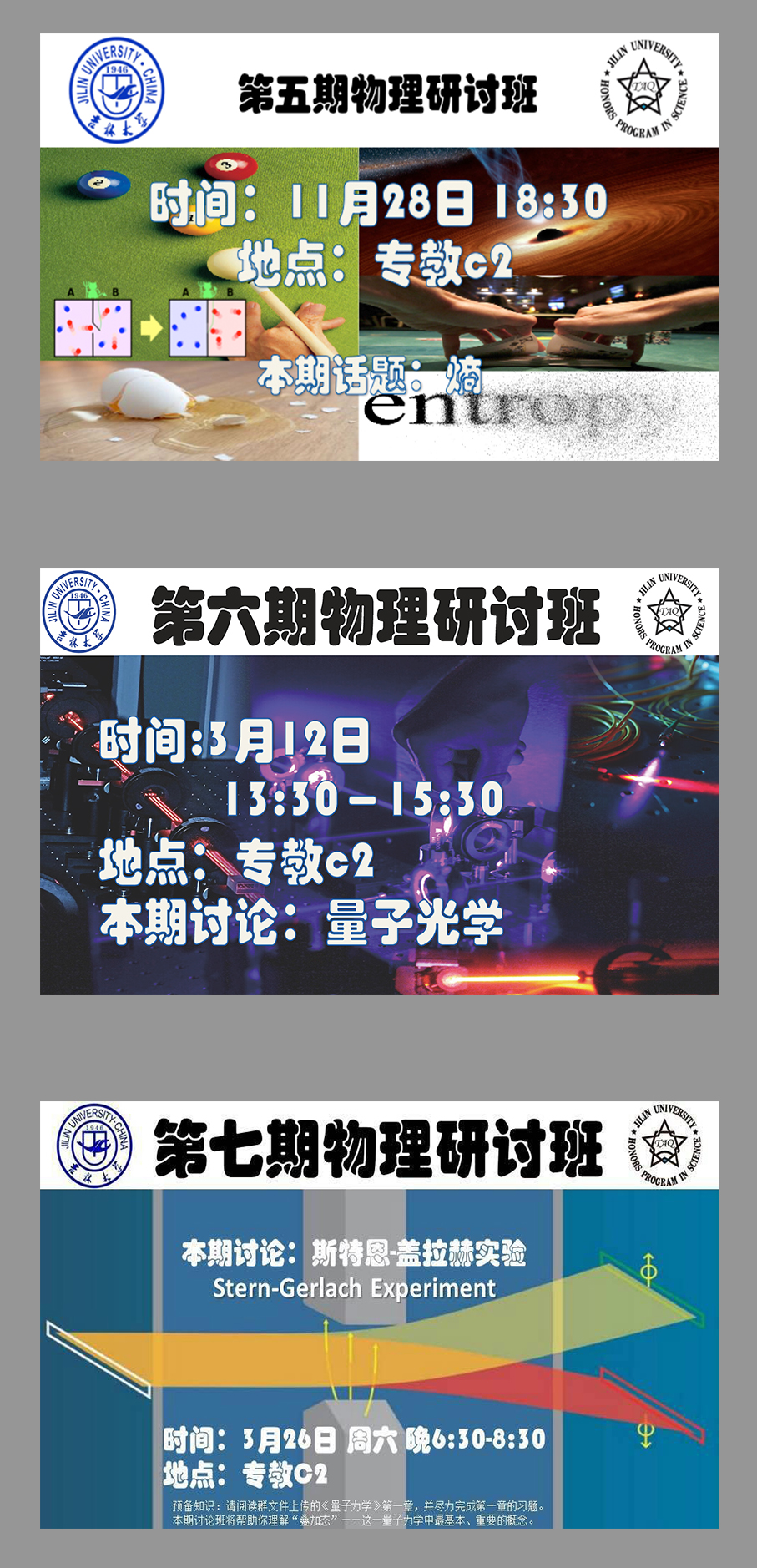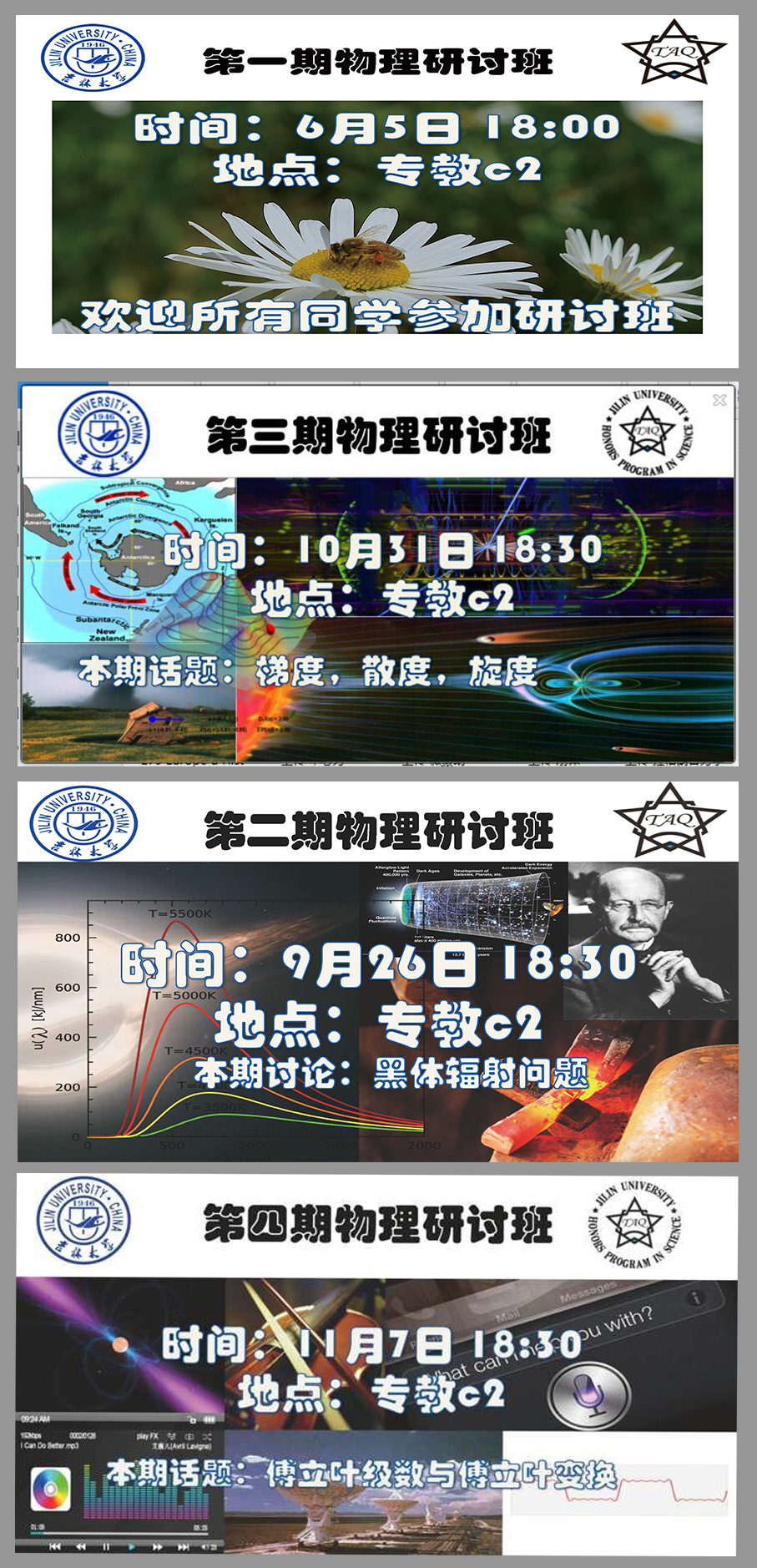 物理研讨班”目前已举办了七期,内容涉及“玻色爱因斯坦凝聚”,“黑体辐射”,“梯度,旋度,散度”,“傅立叶级数与傅立叶变换”,“熵”,“量子光学(光与原子相互作用)”,“斯特恩-盖拉赫实验”等等,每期活动时长约为2个小时,得到了动漫巴士