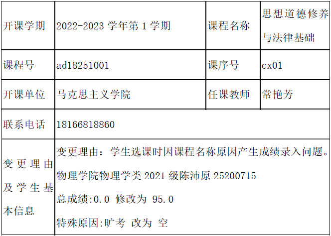 公示日期: 2023年_10月_17日至2023年_10月_23日如有异议请于公示期内向教务处教学运行科反映。 联系人: 邹老师 联系电话: 0431-85168962 相关材料详见附件: 1.动漫巴士 考核成绩复查、修改登记表 2.学院情况说明(学院教学委员会讨论通过、签字盖章) 3.试卷等相关佐证材料