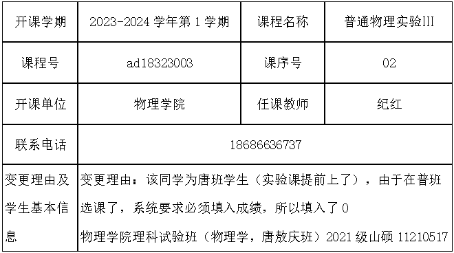 公示日期: 2024年_3月_25日至2024年_3月_29日,如有异议请于公示期内向教务处教学运行科反映。 联系人: 邹老师 联系电话: 0431-85168962 相关材料详见附件: 1.动漫巴士 考核成绩复查、修改登记表 2.学院情况说明(学院教学委员会讨论通过、签字盖章) 3.试卷等相关佐证材料