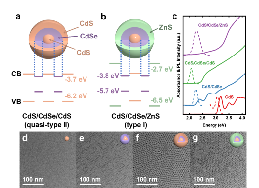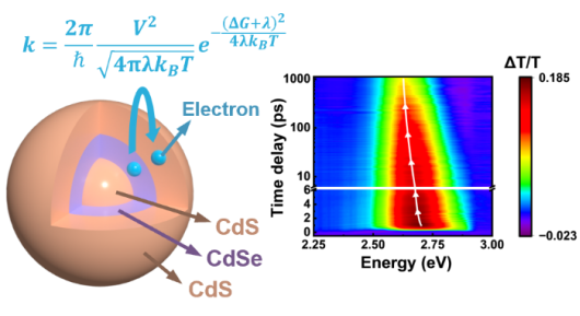 量子阱结构的设计对于核壳结构量子点的界面应力释放有着优良的效果,但其激子动力学过程仍不明确。特别是其中快过程的基态漂白峰红移现象,过去的研究大多将其定性归因于载流子的迁移过程。熊睿翔等人结合了Marcus理论和量子限域效应,对此过程进行了定量建模,完美解释了这一迁移过程,证实量子阱的准II型能带结构促进了电子转移。