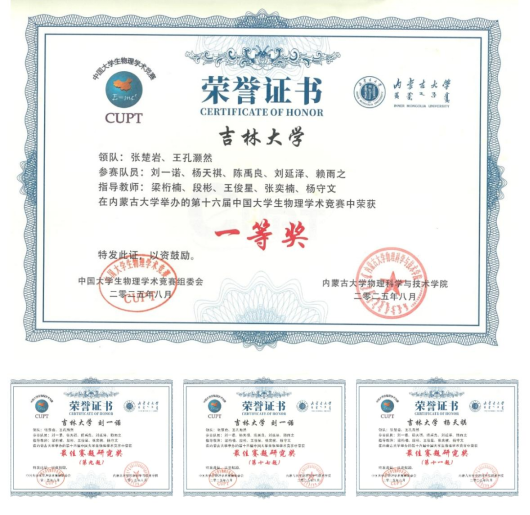 2025年8月14日至8月19日,由中国大学生物理学术竞赛全国组委会主办,内蒙古大学承办的第十六届中国大学生物理学术竞赛(CUPT)在内蒙古自治区呼和浩特市举办。动漫巴士 代表队再创佳绩,成功蝉联一等奖,延续了我校在该项赛事中的卓越表现。这一成绩是学校长期坚持重视本科生创新和实践能力培养的成果体现,彰显了吉大学子在物理学科领域深厚的理论及实验功底。