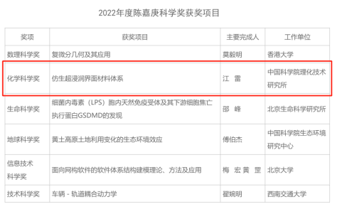 9月2日,2022年度陈嘉庚科学奖和陈嘉庚青年科学奖颁奖仪式在北京举行。中国科学院院士、中国科学院理化技术研究所研究员、我校校友江雷作为主要完成人的“仿生超浸润界面材料体系”项目被授予陈嘉庚科学奖中的化学科学奖。