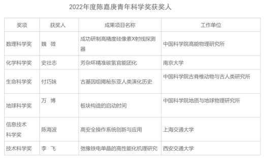 陈嘉庚科学奖基金会是2003年在民政部注册成立的慈善组织,由中国科学院和中国银行共同出资,业务主管单位是中国科学院。陈嘉庚科学奖和陈嘉庚青年科学奖旨在奖励近期在中国做出重大原创性科学技术成果的科学家和青年科技人才。2022年度,共有6个项目、7位科学家共同获得陈嘉庚科学奖,6位青年科技人才获得陈嘉庚青年科学奖。
