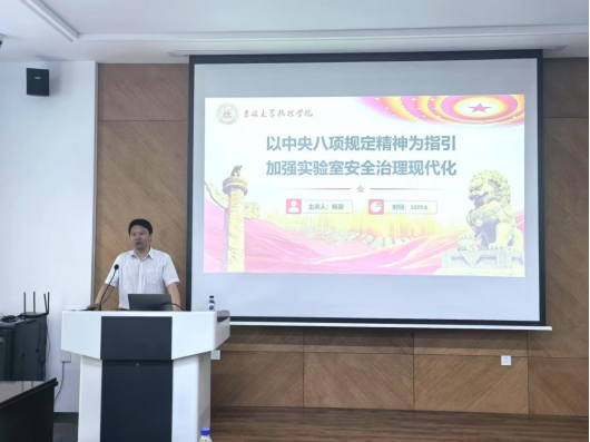 为深入贯彻落实中央八项规定精神学习教育,推进党建工作与学院中心工作深度融合,强化师生党员的纪律意识和责任担当,6月26日,动漫巴士 党委书记杨景在物理楼333报告厅以“以中央八项规定精神为指引 加强实验室安全治理现代化”为题,为师生党员代表、安全员讲授了专题党课,学校党建联络员孟文卓列席,会议由党委副书记杨讴菡主持。