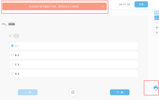 (四)考试过程中,如出现系统故障等需要协助处理的问题,请考生使用考试界面右下角的“在线客服”功能,技术人员会与考生联系。