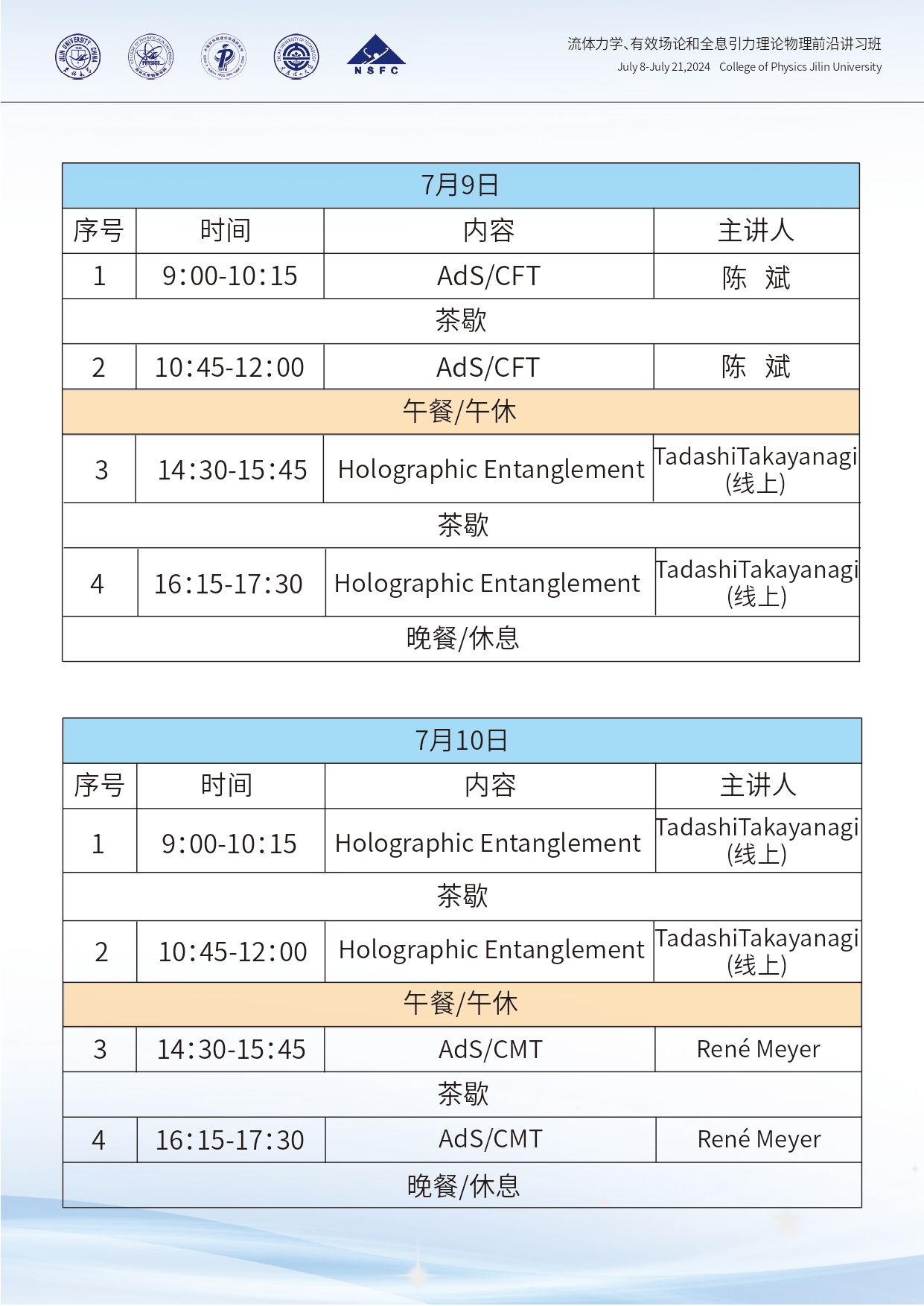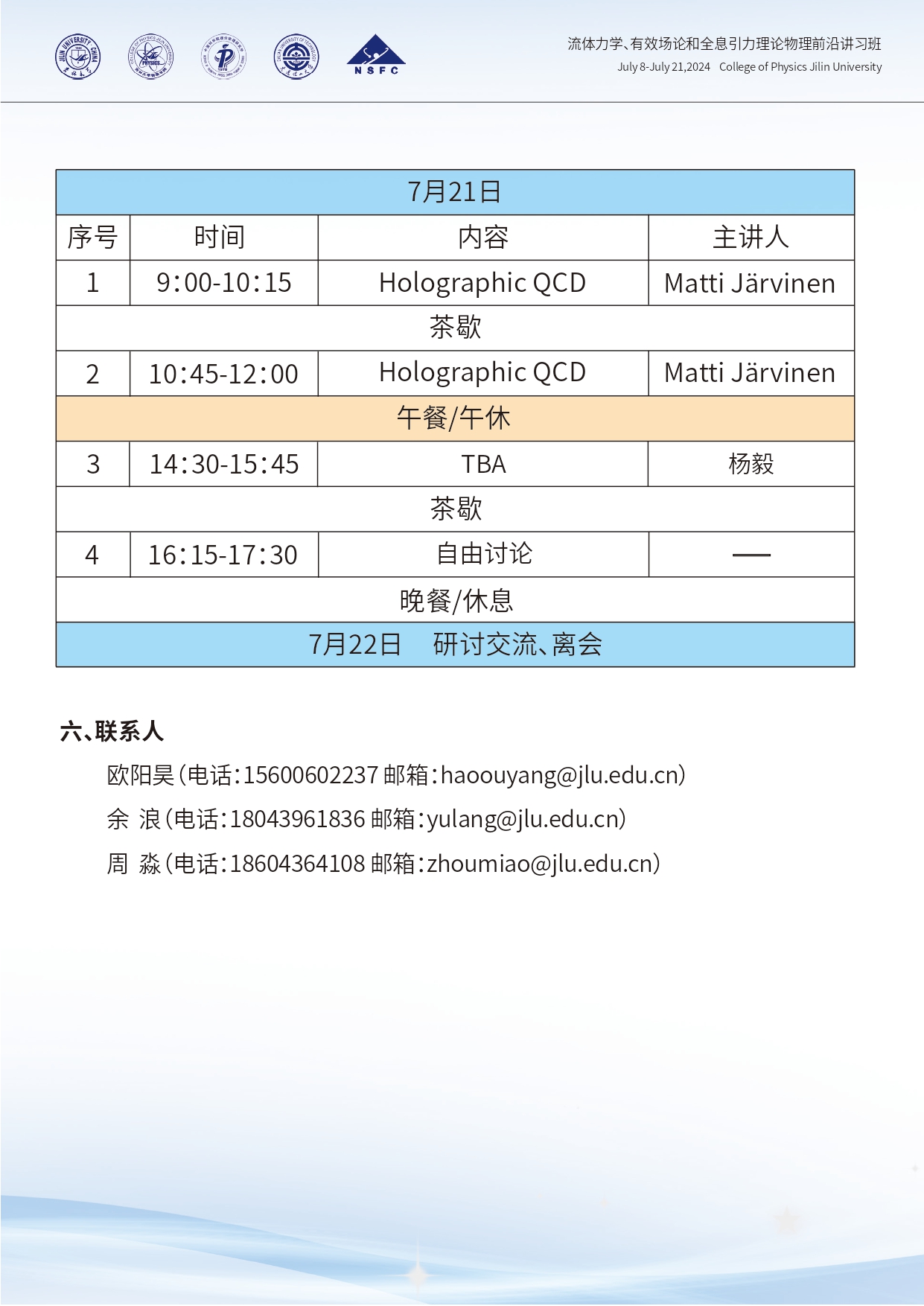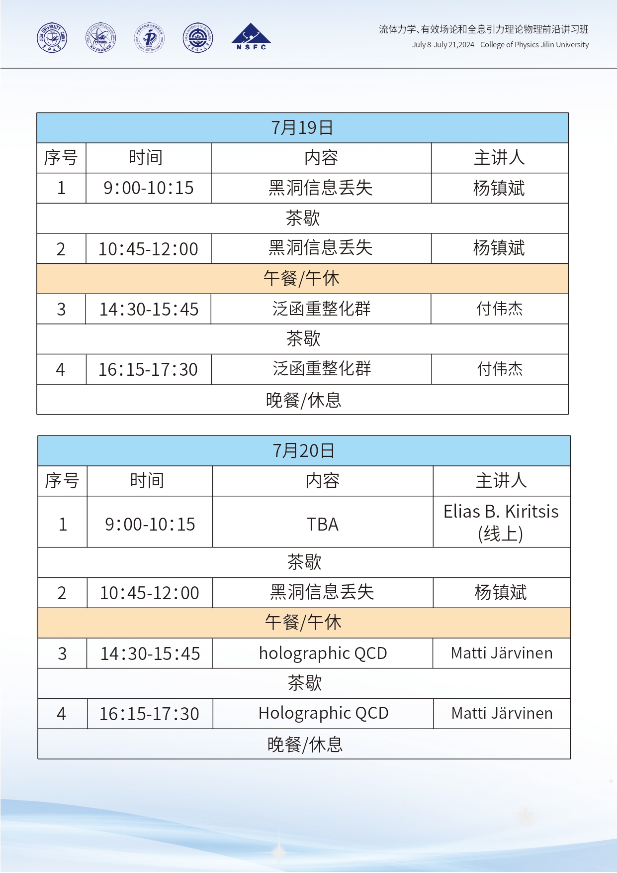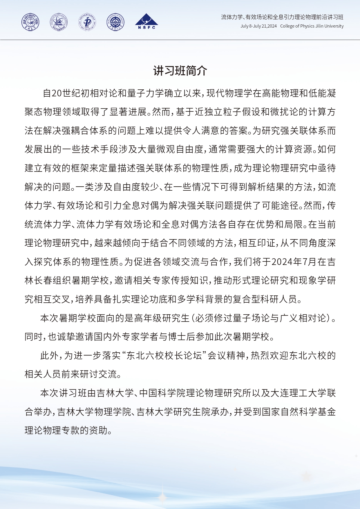 流体力学、有效场论和全息引力理论物理前沿讲习班第二轮通知