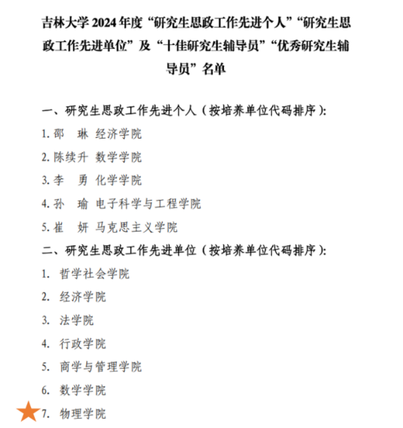 本年度,2021级博士研究生陆文成获“十佳博士研究生”,2021级博士研究生王奎获“吉林省优秀大学生”,2023级博士研究生代政辰等3人获校“优秀共产党员”,2023级博士研究生侯鹏飞入选研究生“青云计划”,2021级博士研究生崔政获“学雷锋标兵”,2022级硕士研究生王乐强等6人获“优秀志愿者”;2019级博士研究生尚宇琛获“第七届动漫巴士