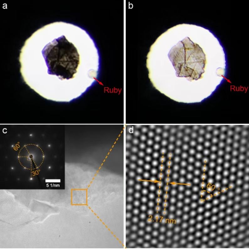 刘冰冰教授在文中详细阐释了高压高温(HPHT)技术的发展脉络。早期科学家曾尝试通过铁管压缩碳氢化合物(James Hannay,1879)或熔铁淬火(Henri Moissan,1893)等方法合成金刚石,但直到Bundy团队设计出能产生10GPa、2300K的专用压机,才实现稳定合成。现代多面砧装置技术已在亚毫米级样品腔突破60GPa极限,刘冰冰教授团队今年基于国产多面砧压机更在毫米级样品腔上实现室温60GPa、1900K高温50GPa的超高压强。