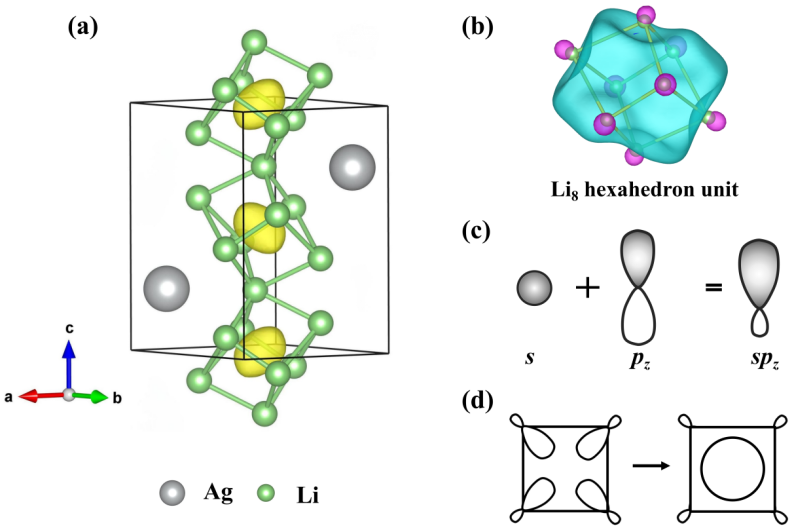 图1 (a) Cmcm Li7Ag结构示意图。(b)Wannier函数投影揭示的Li8六面体单元内电子局域特征。(c)s轨道与pz轨道的杂化轨道示意图。(d)通过Li spz杂化轨道指向中心区域形成的多中心键示意图。