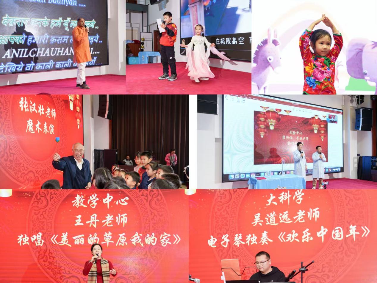 颁奖环节后,联欢会进入轻松愉快的文艺表演与互动阶段。吴道远老师以一曲热情洋溢的电子琴独奏《欢乐中国年》拉开表演序幕,瞬间点燃了全场的新春气息。王丹老师深情演唱《美丽的草原我的家》,悠扬的歌声仿佛将大家带入辽阔草原。随后,童趣盎然的歌伴舞登场,展现了学院教职工家庭的温馨与活力。外教VINDY带来别具特色的英文独唱,以动人嗓音跨越语言,传递了节日祝福。