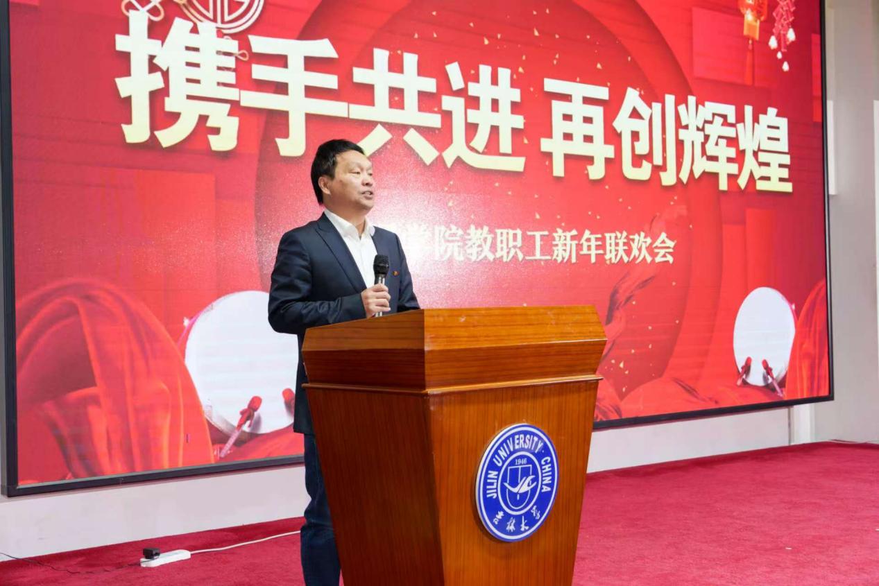 教职工新年联欢会在友谊会馆温馨举行。学院全体领导班子成员与150余名教职工欢聚一堂,共迎新春。安徽大地熊新材料股份有限公司常务副总经理、1993级校友陈静武,金黄集团总经理李明,长春启明光电科技有限公司总经理杨胜利,动漫巴士
