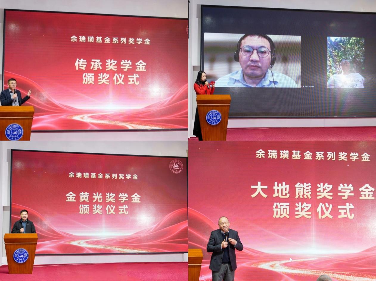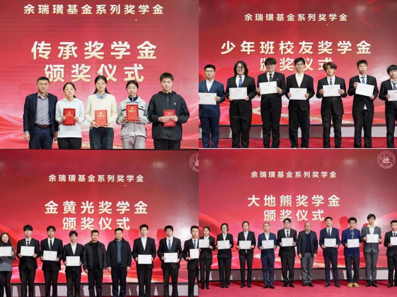 活动的重点环节是余瑞璜基金系列奖学金颁奖仪式。该系列奖学金以学院奠基人余瑞璜先生命名,涵盖传承奖学金、少年班校友奖学金、金黄光奖学金和大地熊奖学金,旨在通过多元激励融入学生成长全过程。2000级校友郭庆、金黄集团总经理李明、93级校友陈静武分别作为相应奖学金的捐赠方代表为获奖学生颁奖并送上祝福。92级校友陈汉栋、93级校友于猛通过线上方式寄语学子,勉励他们接续奋斗。