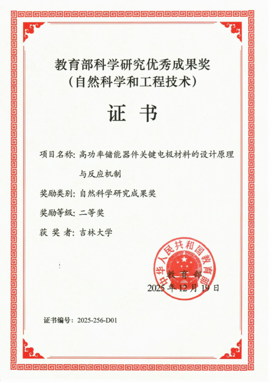 近日,2025年度教育部科学研究优秀成果奖(自然科学和工程技术)获奖名单正式公布。由我院新型电池物理与技术教育部重点实验室杜菲教授作为第一完成人,联合魏芷宣教授、陈岗教授,材料科学与工程学院曾毅教授、化学学院乔振安教授共同完成的“高功率储能器件关键电极材料的设计原理与反应机制”项目,荣获自然科学研究成果奖二等奖