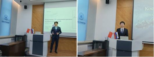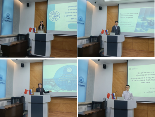 2023级学生聚焦前沿物理理论、航天工程、新材料、氢能利用等领域展开汇报。李飞翔以“Квантование трехмерных суперсимметричных калибровочных теорий с расширенной суперсимметрией”为题,探究扩展超对称性下三维超对称规范理论量子化的数学研究方法;曾圣皓以“Космический лифт: технология космических перевозок будущего”为题,解析太空电梯工作原理、材料瓶颈与未来航天应用前景;刘苏瑾以“Влияние водорода и ионизирующего излучения на структуру и свойства современных материалов”为题,剖析氢和电离辐射对现代材料结构性能的作用机理,并分享抗损伤材料设计思路;张睿元以“Плазменные двигатели для космических миссий будущего”为题,阐述等离子体发动机在未来航天任务中的推进优势与应用价值;张忻宁以“Системы хранения и очистки водорода на основе металл-органических каркасов и гидридообразующих металлов”为题,围绕金属有机框架材料储氢、氢能净化前沿技术,结合国内实际案例展开论述;崔珈瑀以“Особенности формирования водородной подсистемы в решетках палладия и никеля”为题,分析钯、镍金属内部氢子系统形成规律及其在生成生活中的应用场景。