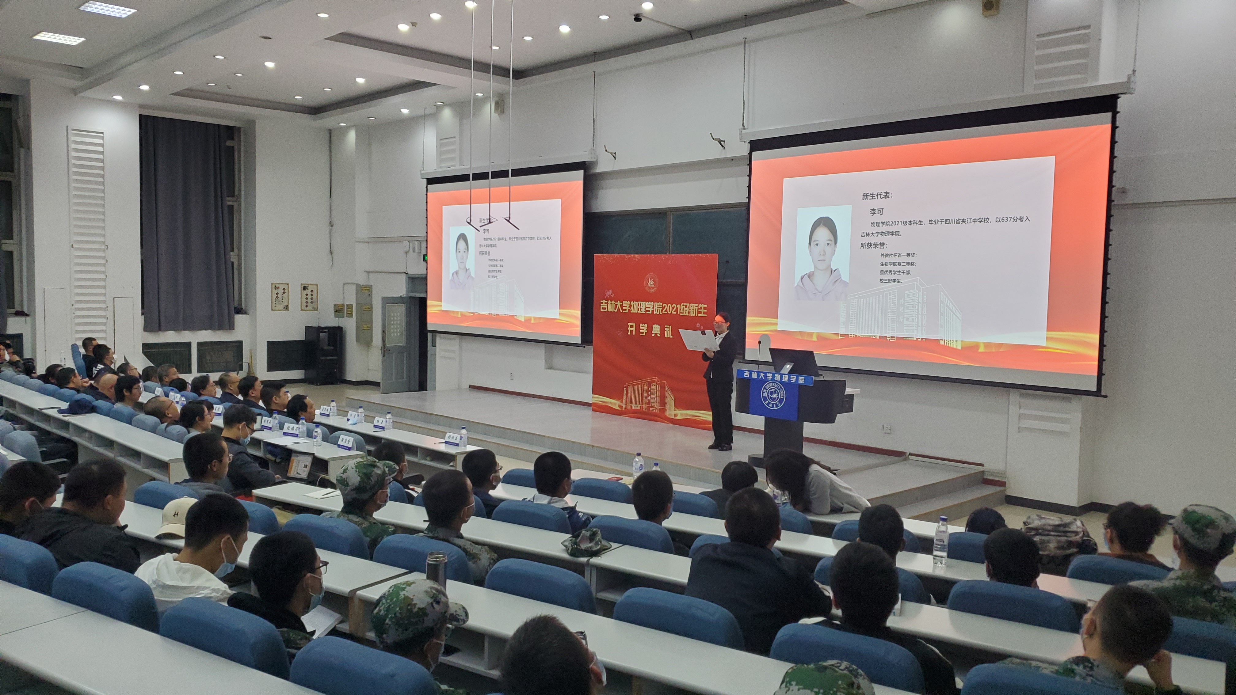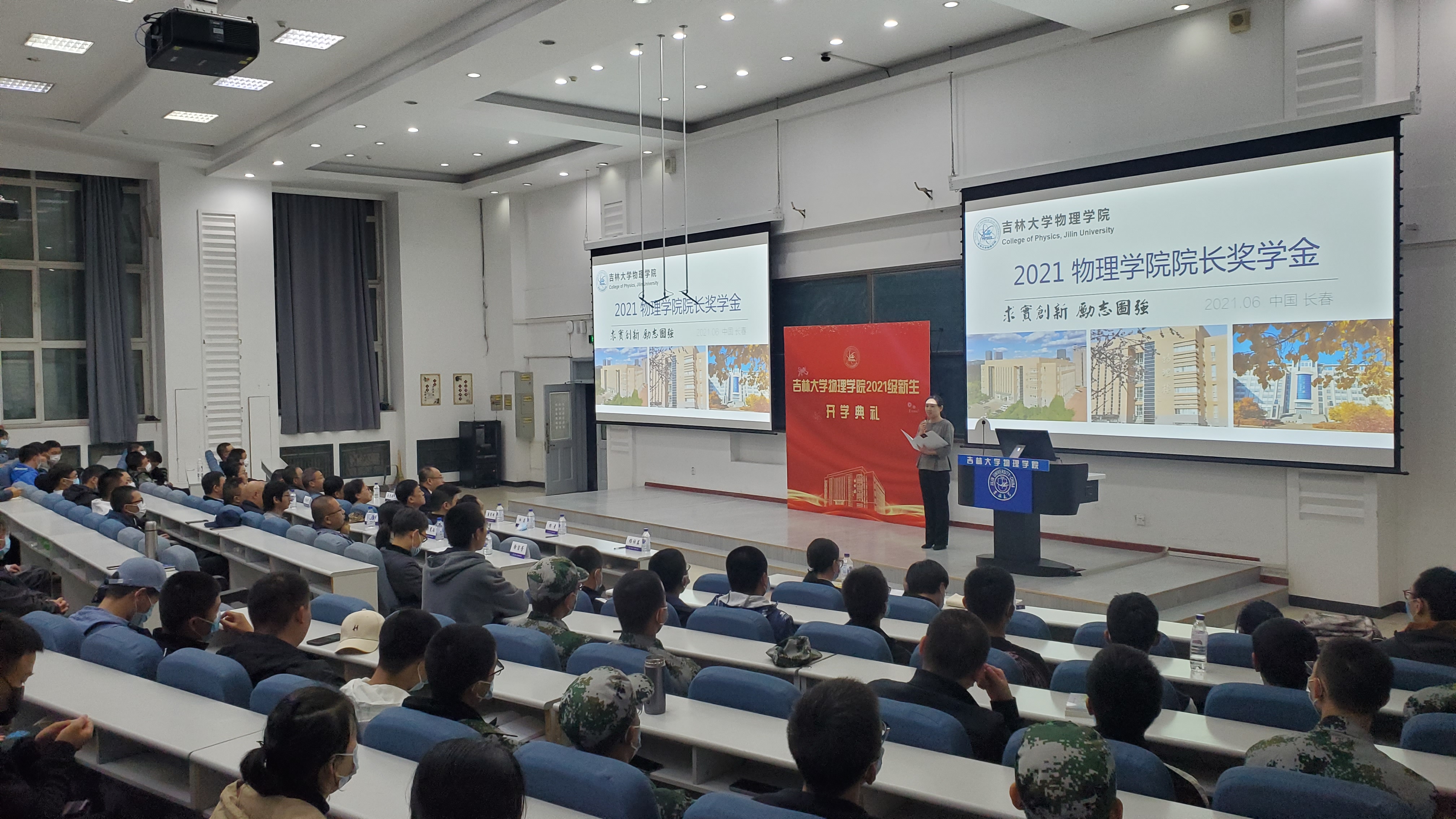紧接着,学生代表发言。2021级李可同学作为新生代表,以昂扬的精神面貌,展现了 2021级新生不惧困难,怀着对物理的信仰,对未知的渴望,肩负着师长的嘱托,民族的希望,努力奋斗的精神品质。2020院长奖学金获得者之一的廖一朴同学作为老生代表向新同学们分享了自己在动漫巴士
