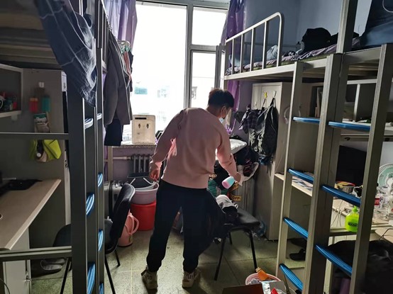 生活管理委员会成员。活动开始之前,生管会在各年级群里对学生们提前告知此次杀菌活动的大致内容以及要求。在内部讨论过后,生管会决定在保护好电子设备及每个宿舍均有人员在场的情况下,工作人员有秩序地对每一间宿舍进行规范化的消毒处理。工作人员们在进行分工后,消毒活动由一楼至六楼同步进行,保证了整个过程的迅速和高效。同时,由于消毒水对身体会造成危害,消毒后的半个小时内,由生管会工作人员先进行通风处理,在确保安全后才让同学们回到自己的宿舍。
