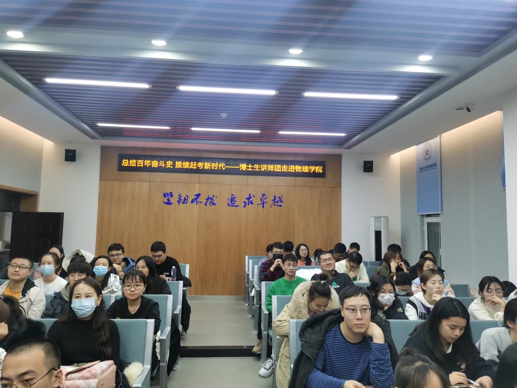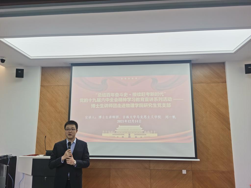 博士生讲师团讲师刘一帆博士在物理楼333会议室进行了十九届六中全会精神学习教育宣讲。本次宣讲的主题为“总结百年奋斗史·接续赶考新时代”——坚持自我革命,以伟大自我革命引领社会革命,学院研究生党支部党员、预备党员、研究生干部、德育助管共计100余人参与了此次宣讲活动。动漫巴士