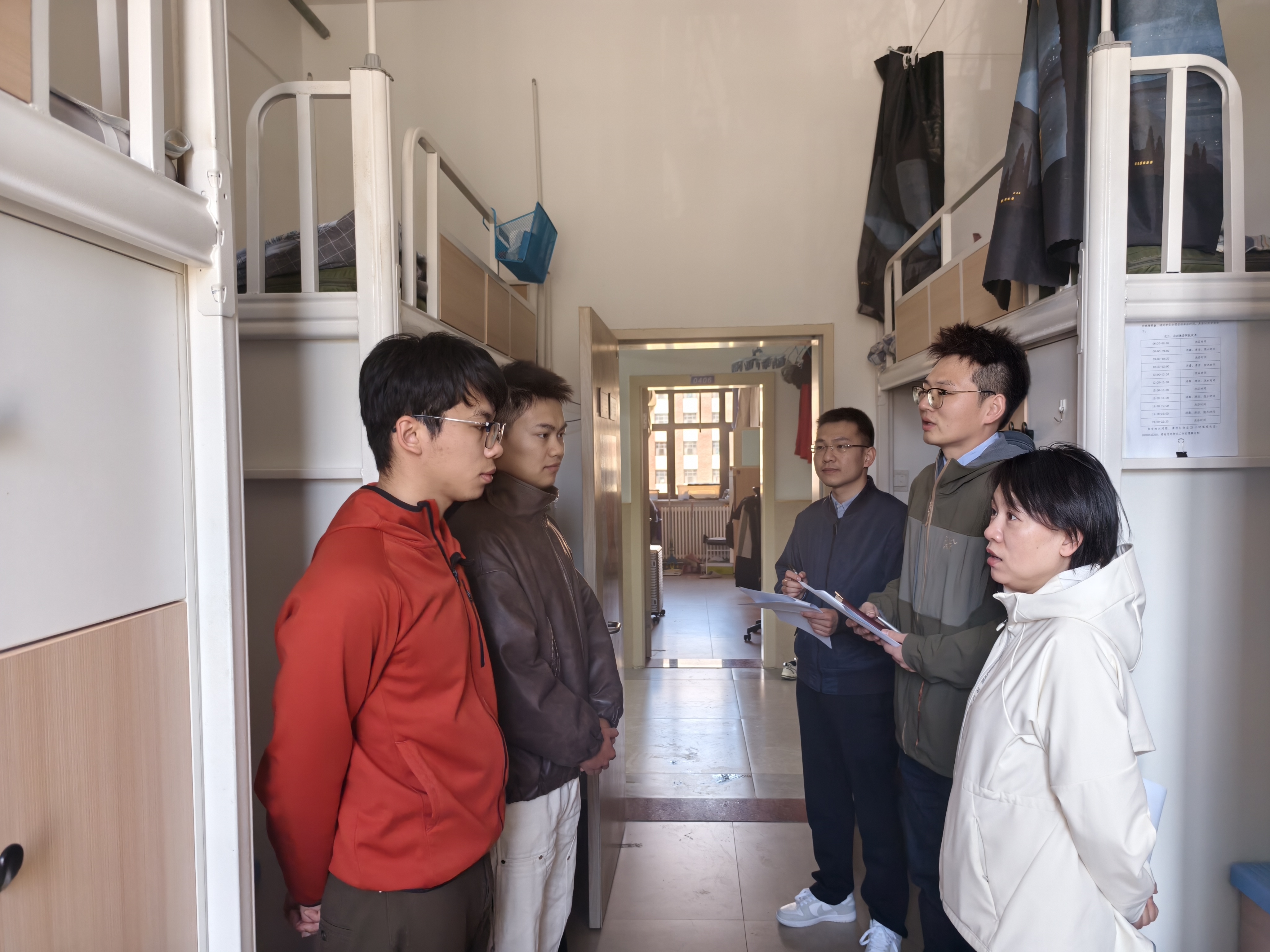 走进学生宿舍,杨讴菡老师以拉家常的方式,与同学们亲切交谈,细致询问宿舍通风采光、设施配备等居住细节,关切生活饮食、作息安排等日常点滴。交流中,她深入了解研究生们的科研实验进度,倾听大家对未来就业方向的规划与困惑。她还鼓励同学们以学院杰出前辈为榜样,在科研道路上保持专注、勇于创新、追求卓越,让宿舍不仅成为休憩之所,更化作攻克学术难题的第二战场。