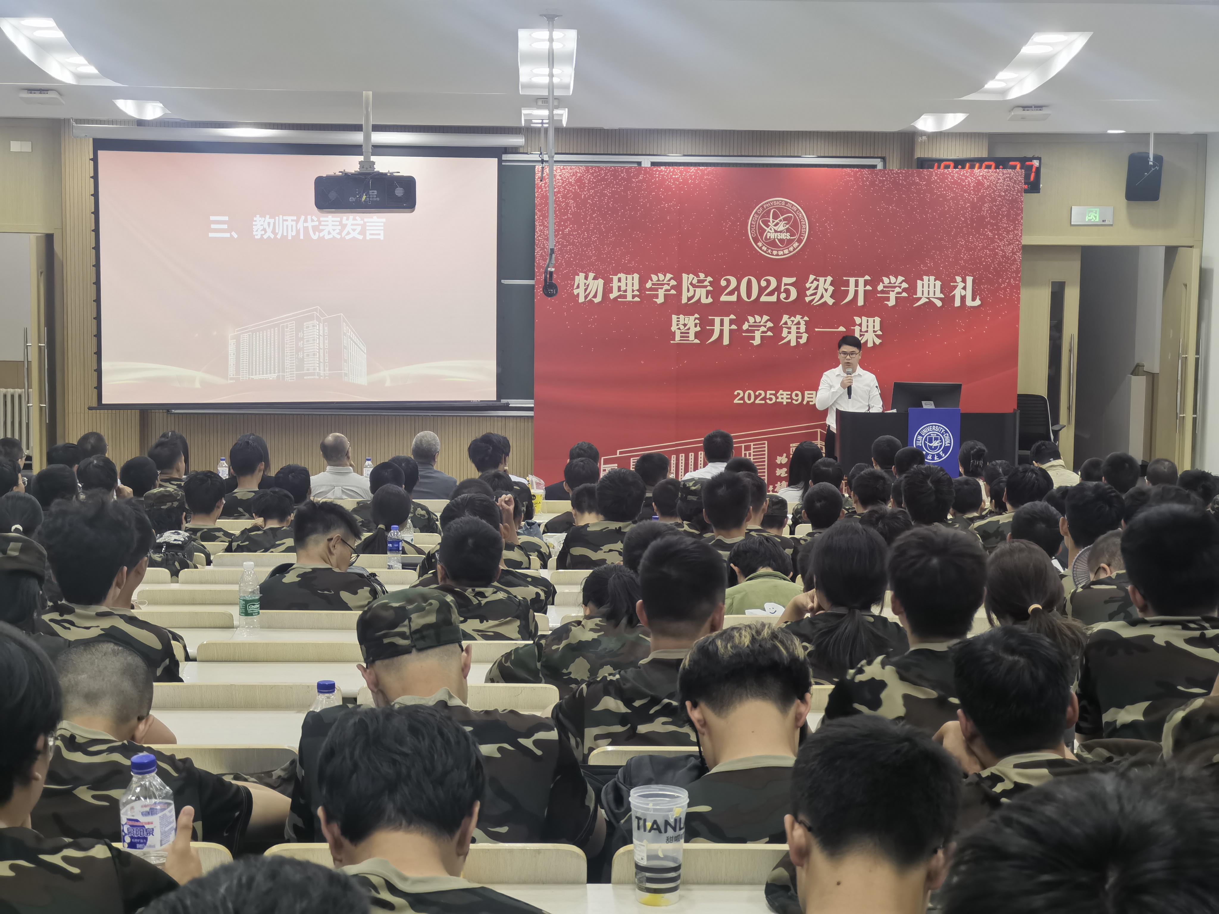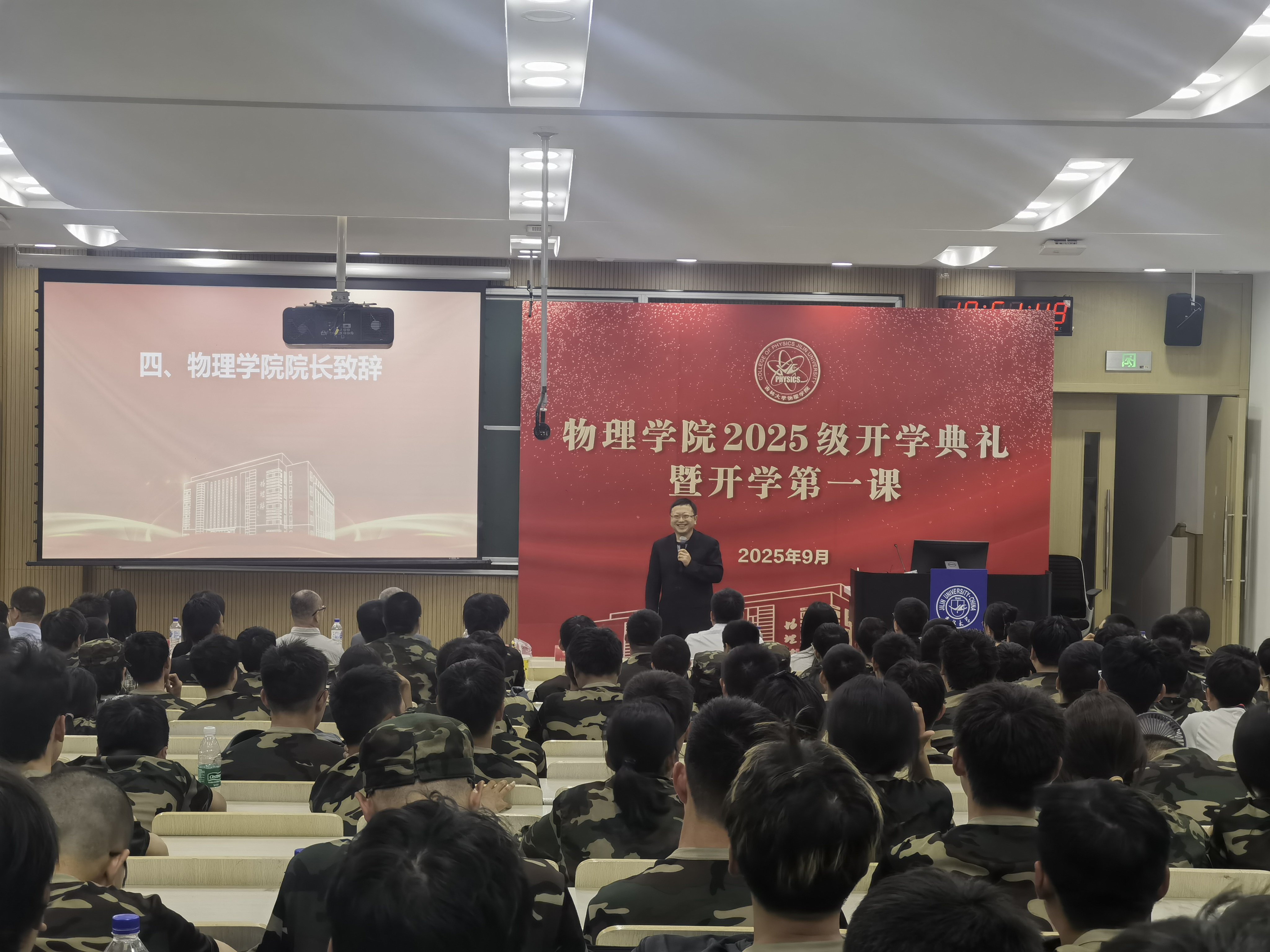 院长邹勃教授致辞。邹院长首先向全体新同学的到来表示欢迎和祝贺,并与大家亲切互动。随后,邹院长指出大学学习自主学习、自主探索的重要性,并强调大学阶段尤其注重对概念的深入理解与清晰把握。最后,院长提出“新时期如何将物理学习与AI相结合”的话题,引发了同学们的思考,他鼓励学生用好新时代技术红利,解锁物理学科的新可能。